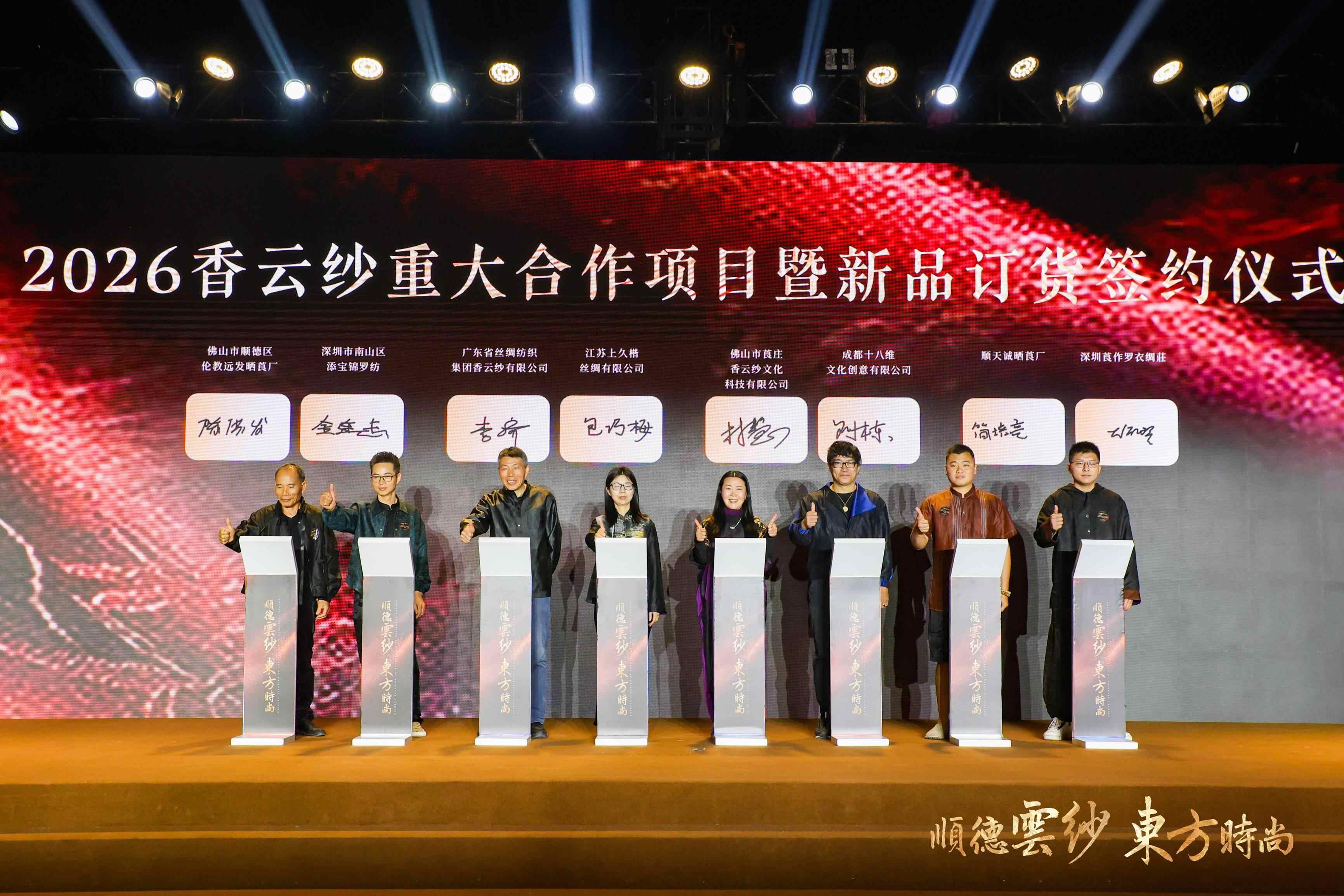 在同期举办的2026香云纱重大产业合作项目暨新品订货签约仪式上,11个项目集中签约,合作总金额达1.89亿元,覆盖文化产业、战略合作、产业链协同及数字溯源等多个领域,展现出香云纱产业强大的商业吸引力和跨区域合作潜力。重要合作包括:广东省丝绸纺织集团香云纱有限公司与江苏上久楷丝绸有限公司达成合作,实现宋锦与香云纱两大“非遗”技艺的融合创新;佛山市顺德区时耐莨绸文化发展有限公司将携手北京鸟巢《远航天梦》太空博物馆研发制作太空类文创产品和服装,并借助鸟巢向世界展示顺德香云纱文化价值,还将携手广东博融和创投资集团、佛山市中营人工智能科技有限公司,利用AI技术开发智能家居产品“智枕云纱”,推动“非遗+科技”跨界融合。