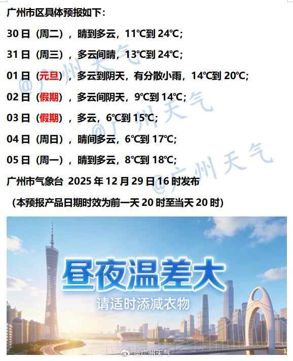 预计,30日,广东西部偏西市县多云间晴,其余市县晴到多云,昼夜温差较大;31日,粤西北、珠三角西部市县多云转阴天,有分散小雨,其余市县多云为主;2026年元旦假期一股强冷空气自北向南影响广东,各地气温明显下降。