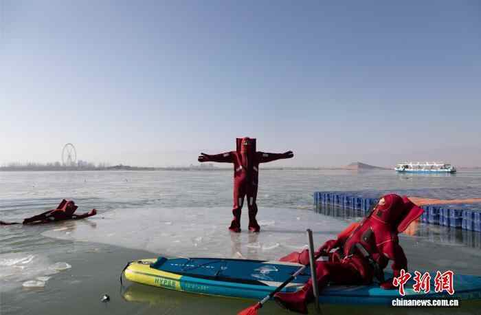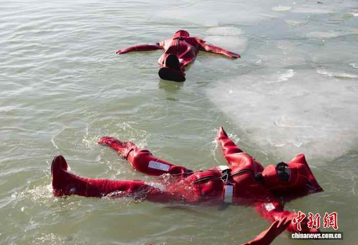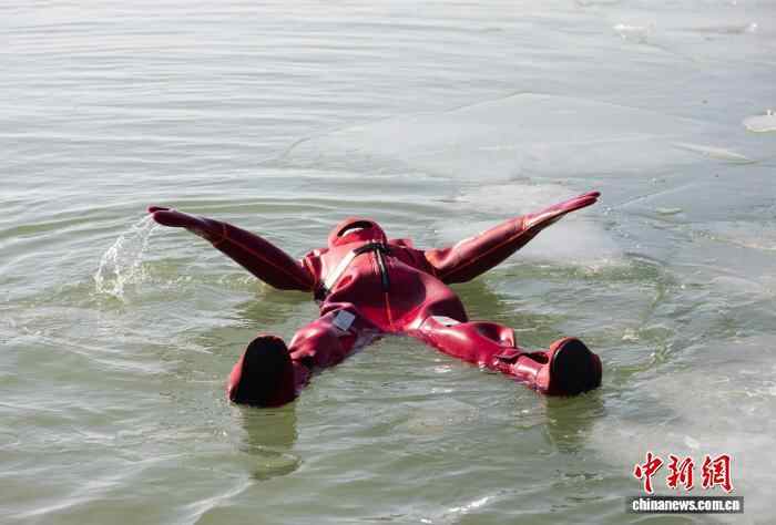 12月27日,宁夏银川,市民身着浸水保温服(又称“龙虾服”),体验冰浮项目。冰浮是一种冬季特色旅游体验,指在凿开的冰面水域中穿着特制防护服漂浮,该活动常见于俄罗斯、芬兰等高纬度国家,近年来引入中国。中新社记者 杨迪 摄
