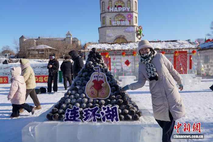 图为游客在活动现场与冻梨堆合照。中新社记者 赵宇航 摄