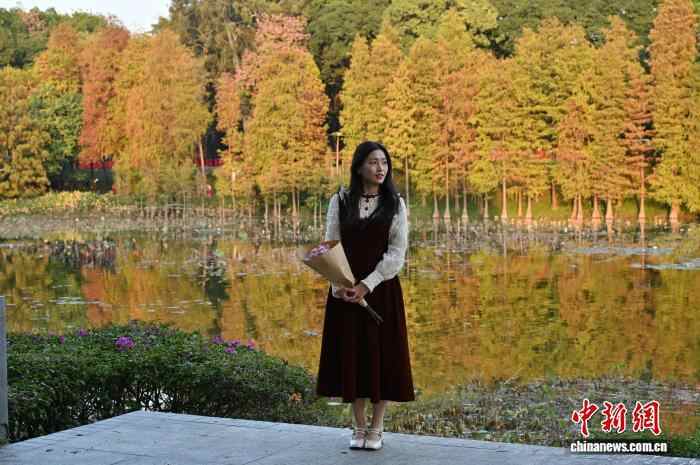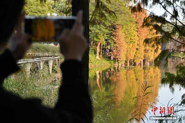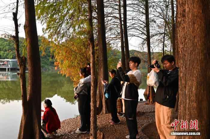 12月27日,广东省广州市麓湖公园的落羽杉换上“冬装”,由绿色转为古铜色或红褐色,吸引游客游园拍照。中新社记者 陈楚红 摄