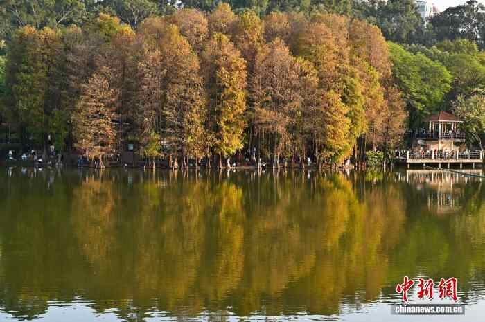 12月27日,广东省广州市麓湖公园的不少落羽杉换上“冬装”,由绿色转为古铜色或红褐色,吸引游客游园观景。中新社记者 陈楚红 摄