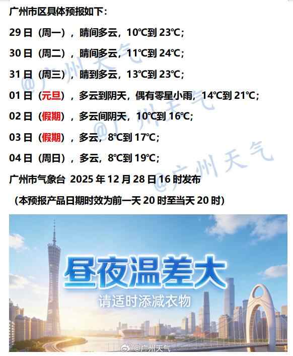 广州方面,未来七天气温先升后降。未来三天天气晴好,气温逐渐回升,昼夜温差大,早晚寒凉中午暖,要采用洋葱式穿衣法。展望元旦假期,新一股冷空气将影响广州,气温明显下降,大家要提前把厚外套厚裤子准备好哦~