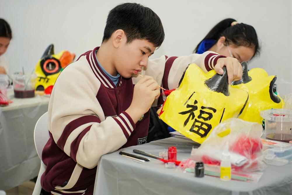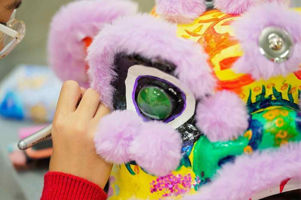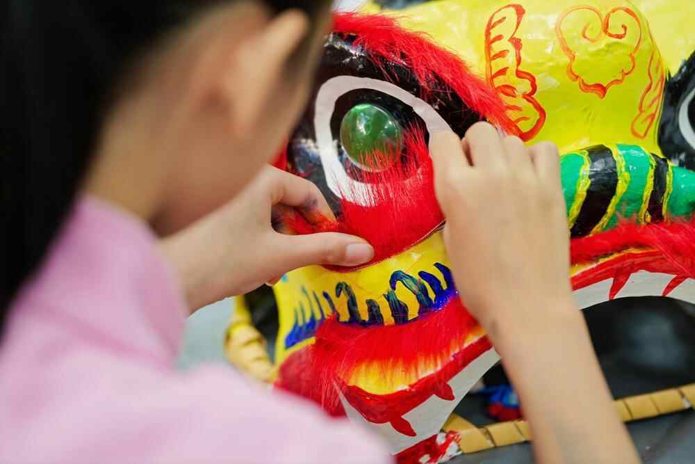 在比赛中,主办方准备了狮头模具,还有胶水、颜料、毛笔等基础工具。在近三个小时的比赛中,青少年从传统剪纸、彩绘工艺中汲取灵感,尽情挥洒创意:有的复刻经典吉祥纹样,色彩醇厚典雅;有的融入现代涂鸦风格,线条灵动鲜活;有的巧用创意手法点缀,细节精致别致……