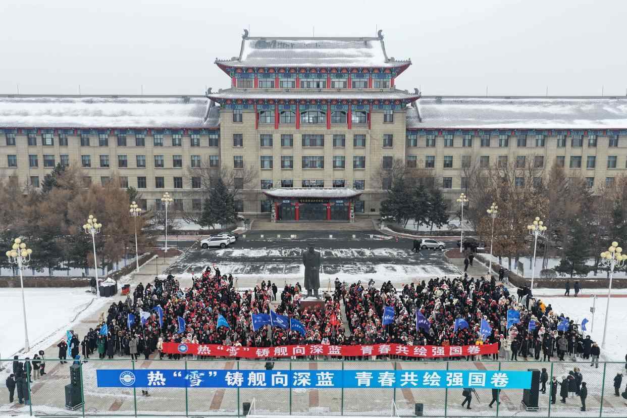 在230米长、112米宽的军工操场上,一艘威武的“福建舰”航母破雪而行,伴随其侧的是三架舰载机……12月28日上午,一场“热‘雪’铸舰向深蓝,青春共绘强国卷”大思政活动,在哈尔滨工程大学举办。