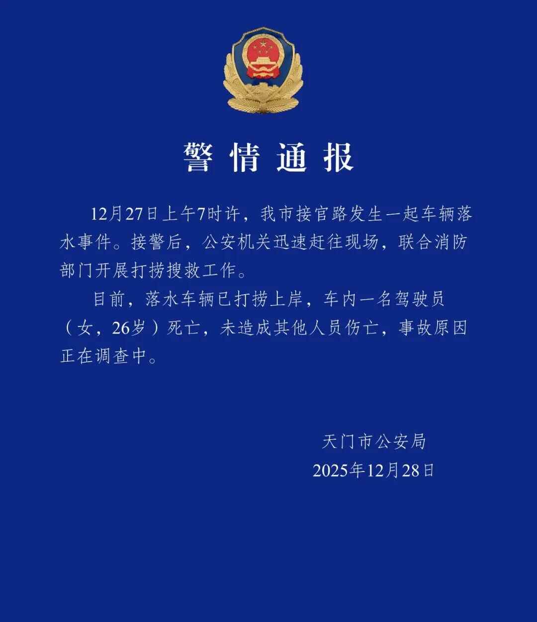 12月27日上午7时许,我市接官路发生一起车辆落水事件。接警后,公安机关迅速赶往现场,联合消防部门开展打捞搜救工作。目前,落水车辆已打捞上岸,车内一名驾驶员(女,26岁)死亡,未造成其他人员伤亡,事故原因正在调查中。