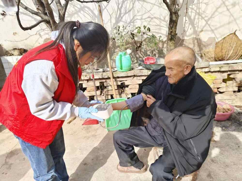 2025年11月,甘肃省陇南市宕昌县益民社会工作服务中心养老护理员赵雪林为南河镇寺卜寨村张尕旦老人测量血压。(李善芳 摄)