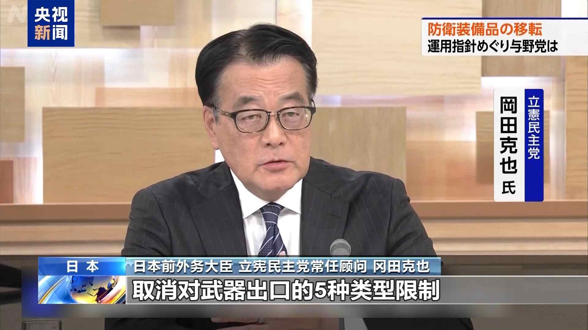 日本前外务大臣 立宪民主党常任顾问 冈田克也:取消对武器出口的5种类型限制,意味着允许具有杀伤能力的武器出口。当前日本防卫预算持续增加,形成军工复合体的风险正在上升。