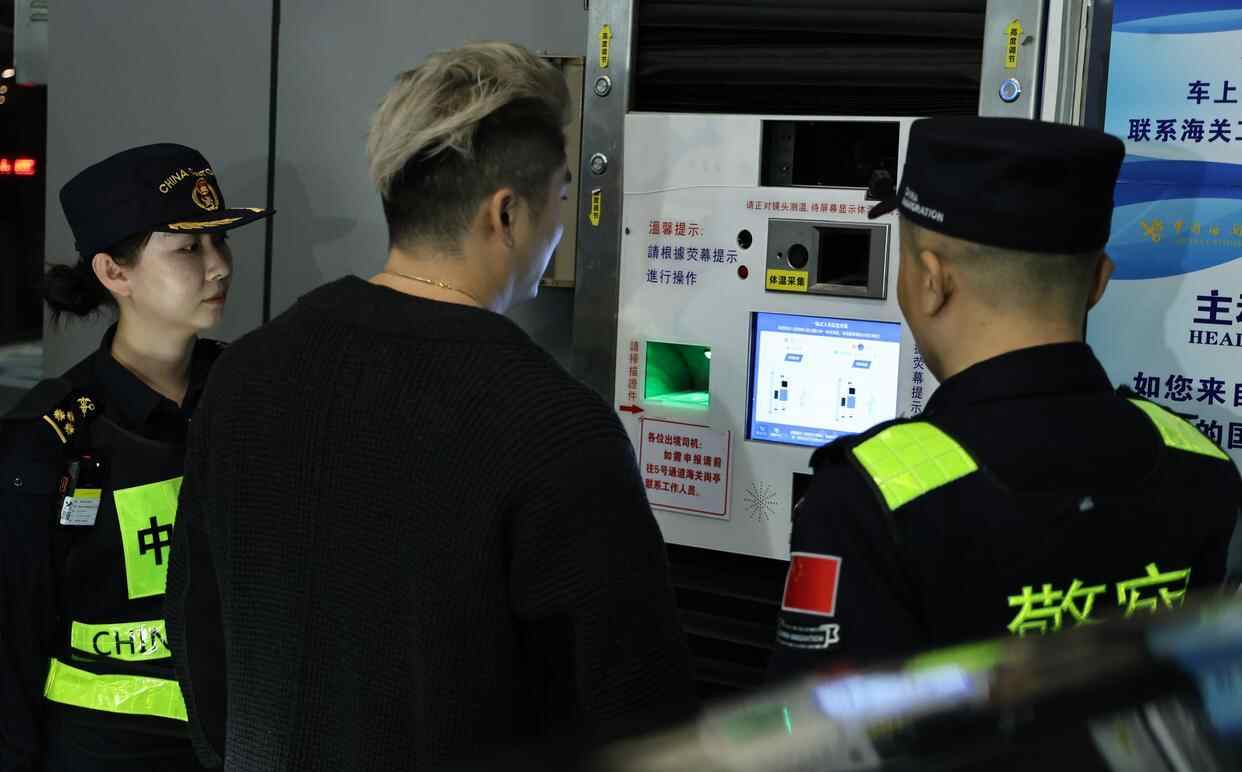 12月23日零时,“粤车南下”入境香港市区的通关车主曹先生(前)在“一站式”通道办理通关手续。新华社记者 黄国保 摄