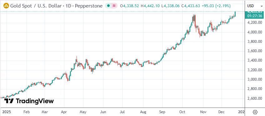 具体行情显示,现货黄金日内一度涨超2.3%报每盎司4442.22美元,现货白银一度涨3.3%报每盎司69.46美元,双双刷新历史纪录,年内金银分别累涨69%和137%,势将创下1979年以来的最大年度涨幅。