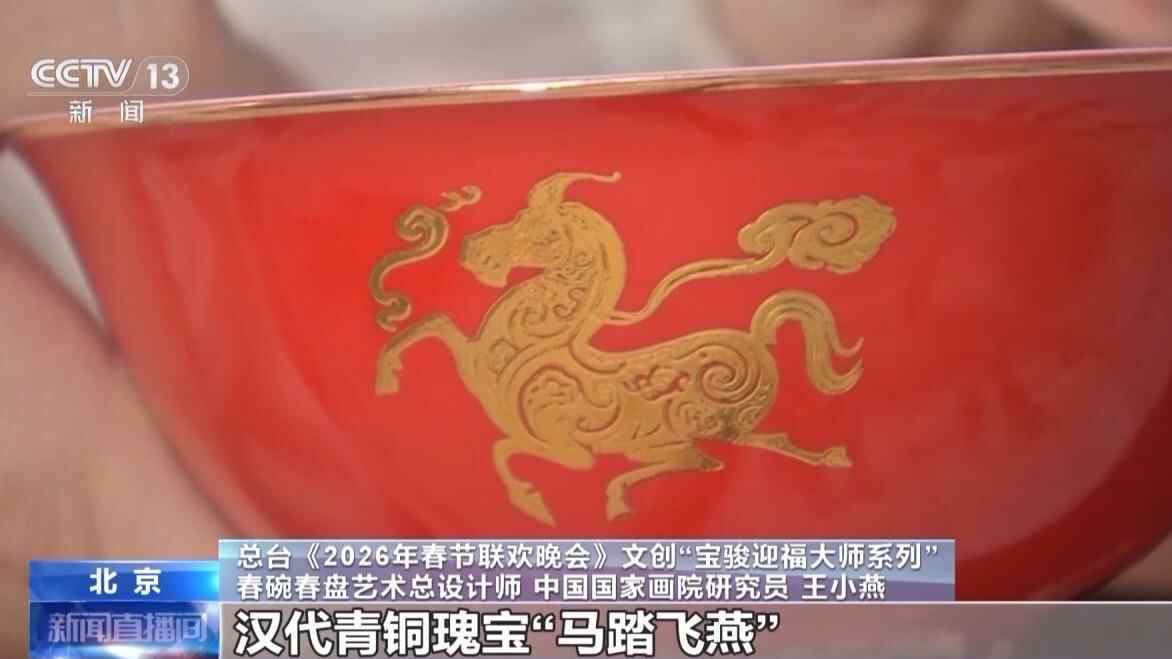 总台《2026年春节联欢晚会》文创“宝骏迎福大师系列”春碗春盘艺术总设计师、中国国家画院研究员 王小燕:“春碗”马的设计灵感源自汉代青铜瑰宝“马踏飞燕”,我们以现代设计语言将矫健的奔马与流转的祥云,通过云雷纹巧妙结合,寓意着超越平凡、直上青云的豪情,马到成功,指日可待。