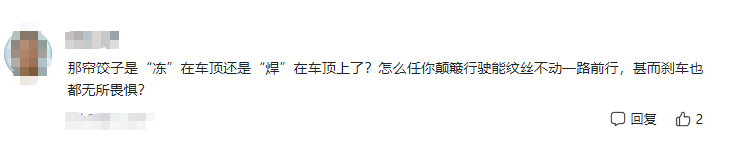 网友纷纷猜测为何这盘饺子在行驶的车顶上能这么“稳”。