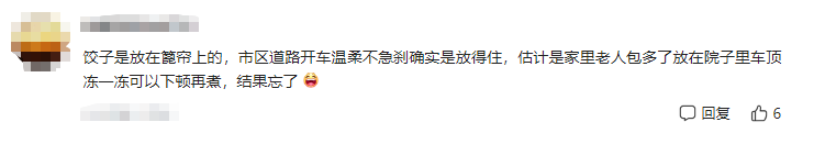 车主后续回应称饺子放在车顶忘了,没想到这个车这么稳,到家饺子都在,已经吃完了。