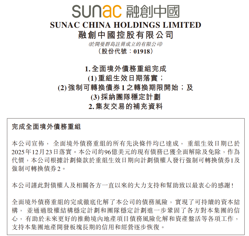 12月23日,融创中国在港交所公告,全面境外债务重组的所有先决条件均已达成,重组生效日期已于12月23日落实。公司约96亿美元的现有债务已获全面解除及免除,作为代价,公司根据计划条款于重组生效日期向计划债权人发行强制可转换债券1及强制可转换债券2。融创中国表示,全面境外债务重组的完成彻底化解了公司的债务风险,实现了可持续的资本结构,并通过股权结构稳定计划和团队稳定计划进一步巩固了各方对该集团的信心,有助于未来更好的推动境内地产项目债务风险化解和资产盘活等各项工作,支持集团地产开发板块长期的信用和经营逐步恢复。