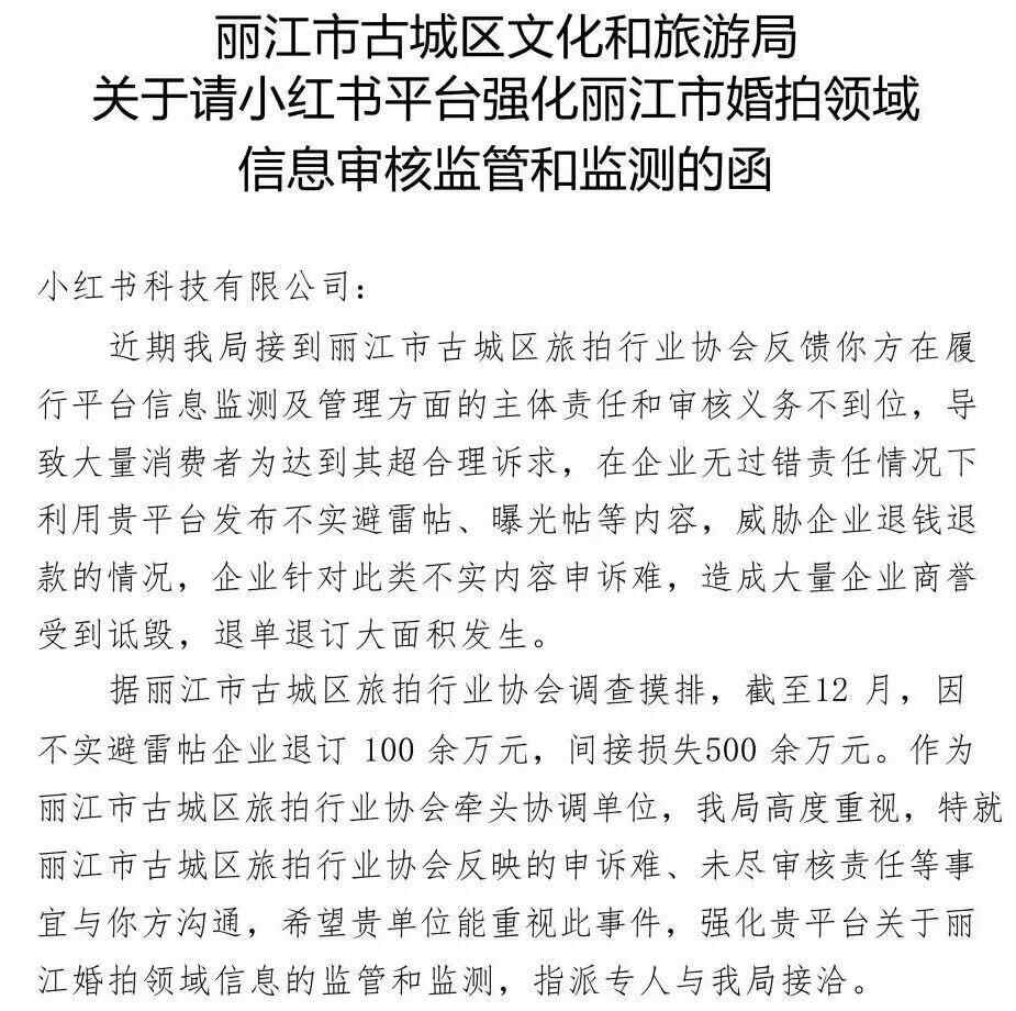 12月23日,云南丽江市古城区文化和旅游局公开发布《关于请小红书平台强化丽江市婚拍领域信息审核监管和监测的函》。