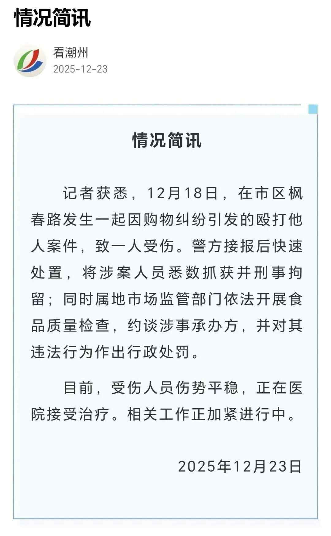 据潮州市相关通报,记者获悉,12月18日,在市区枫春路发生一起因购物纠纷引发的殴打他人案件,致一人受伤。