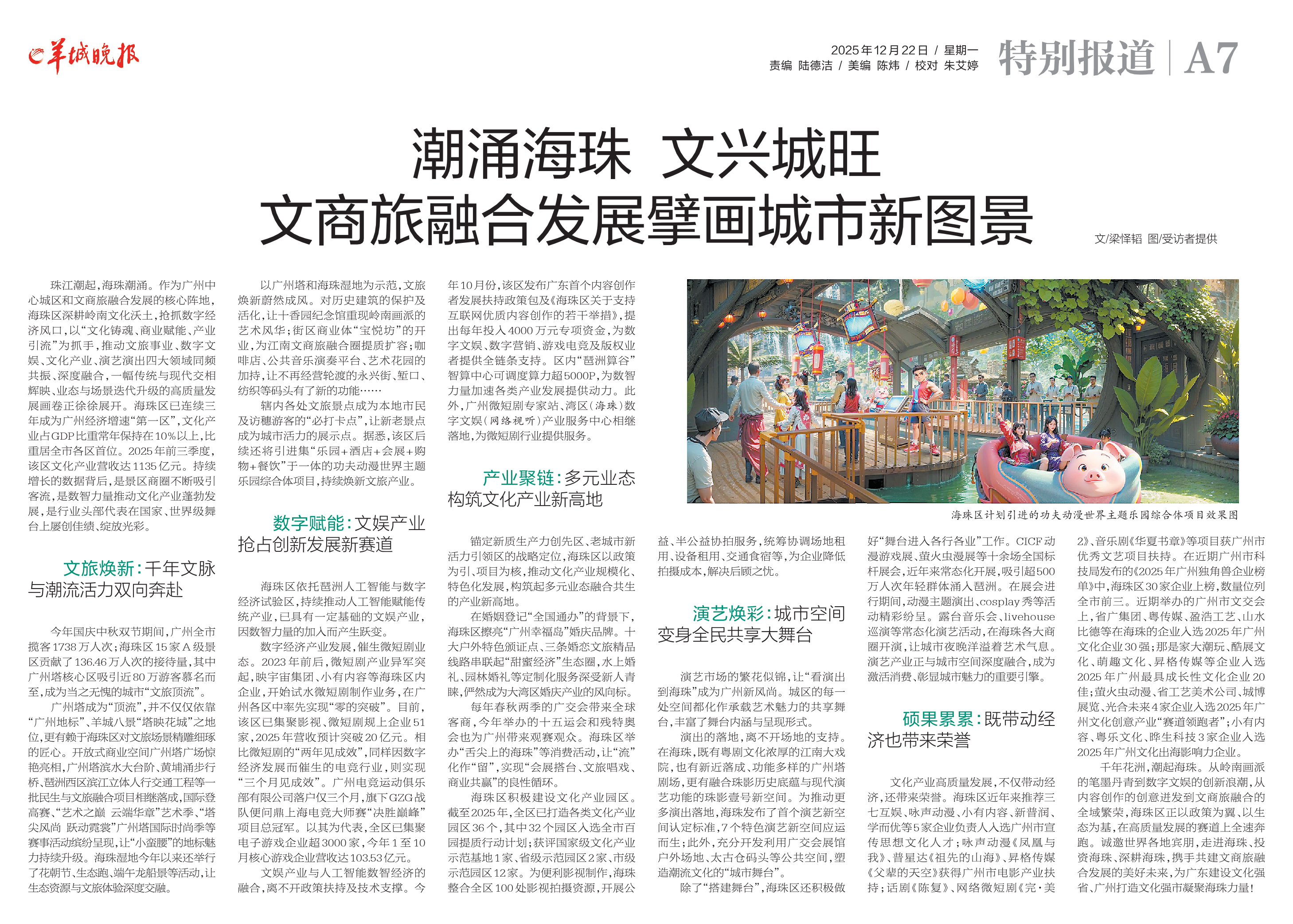 珠江潮起,海珠潮涌。作为广州中心城区和文商旅融合发展的核心阵地,海珠区深耕岭南文化沃土,抢抓数字经济风口,以“文化铸魂、商业赋能、产业引流”为抓手,推动文旅事业、数字文娱、文化产业、演艺演出四大领域同频共振、深度融合,一幅传统与现代交相辉映、业态与场景迭代升级的高质量发展画卷正徐徐展开。