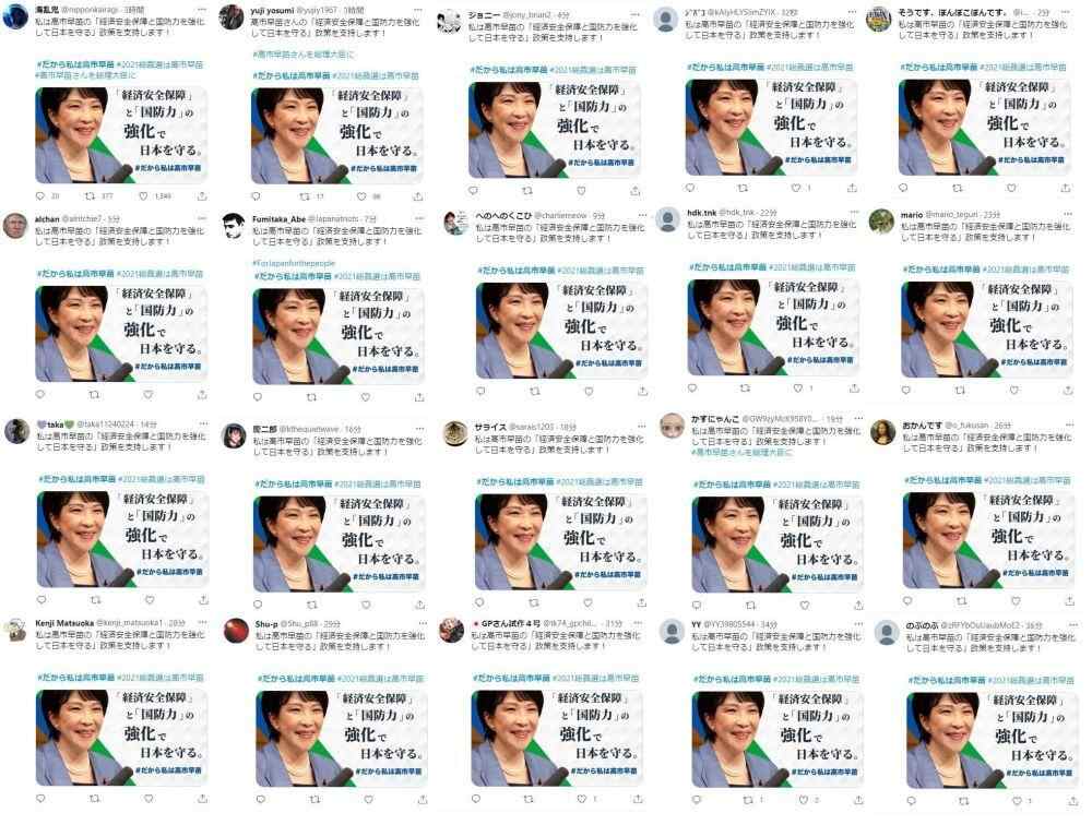 日本社交媒体平台充斥如“当然只能支持高市早苗”“高市早苗拜托了”等内容相似的帖文。