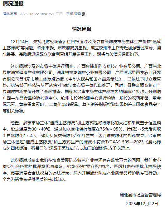 经对报道涉及的市场主体进行调查,广西金浦龙陈皮科技产业有限公司、广西浦北县柑浦堂健康产业有限公司、浦北柑宝龙陈皮茶业有限公司、广西浦北甲丙龙农业开发有限公司等4家市场主体涉嫌违反《中华人民共和国产品质量法》,已依法予以立案查处。执法部门将依法从严从快对4家涉事市场主体作出处理。同时,县联合调查组对全县陈皮市场主体开展了全面排查,抽检含涉事市场主体产品在内的样品31批次,分别送广西—东盟食品检验检测中心、钦州市检验检测中心进行检验,所检的农药残留、重金属元素、黄曲霉毒素B1、二氧化硫残留量、着色剂等指标检验结果均符合国家食品安全等相关标准。