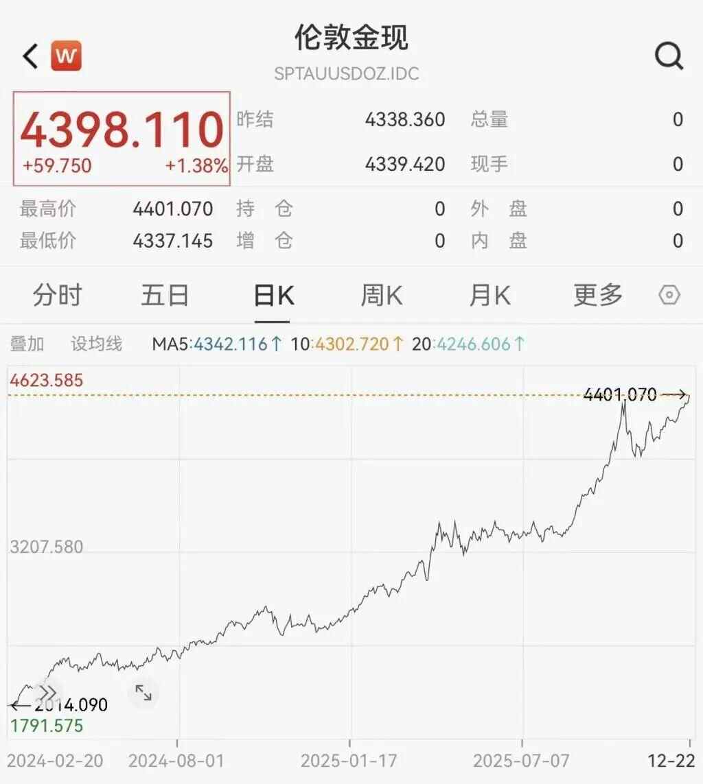12月22日,现货黄金站上4400美元/盎司,为史上首次,年初至今累计上涨逾67%。
