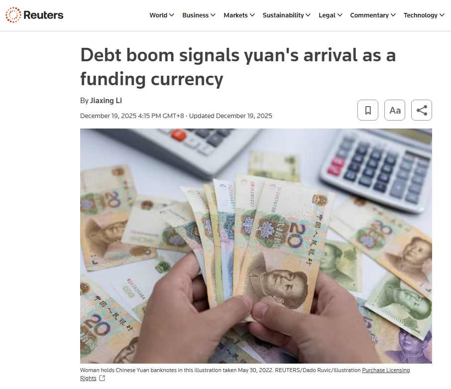 路透社报道称,评级机构认为,相对于波动剧烈的美元和欧元,人民币相对稳定,这进一步增强了人民币融资的吸引力。