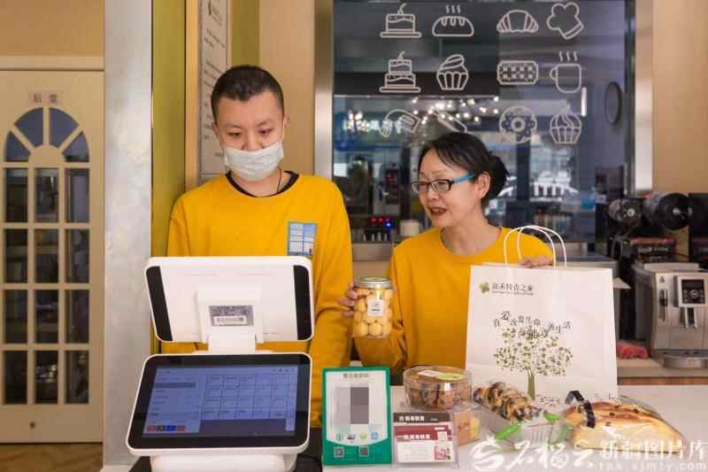 12月17日,乌鲁木齐新禾特青烘焙坊,“心青年”(左)与李秀琴协作收银。 辛轩 摄