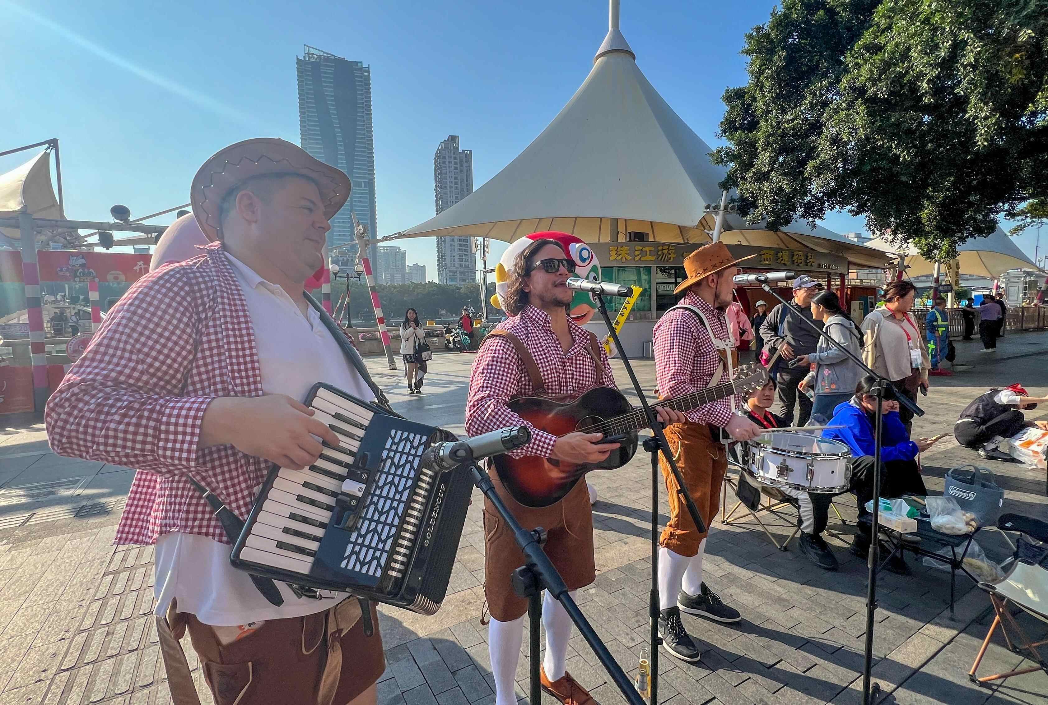 在这里你不仅能看到醒狮、粤剧,还能看到穿着广州本土动画IP玩偶服的啦啦队在外国乐队的鼓点中连蹦带跳。就连补给品也别具特色,除了必备的能量胶、运动饮料外,烧鹅、老火汤等广东特色食物已是每届比赛都能看到的熟面孔。