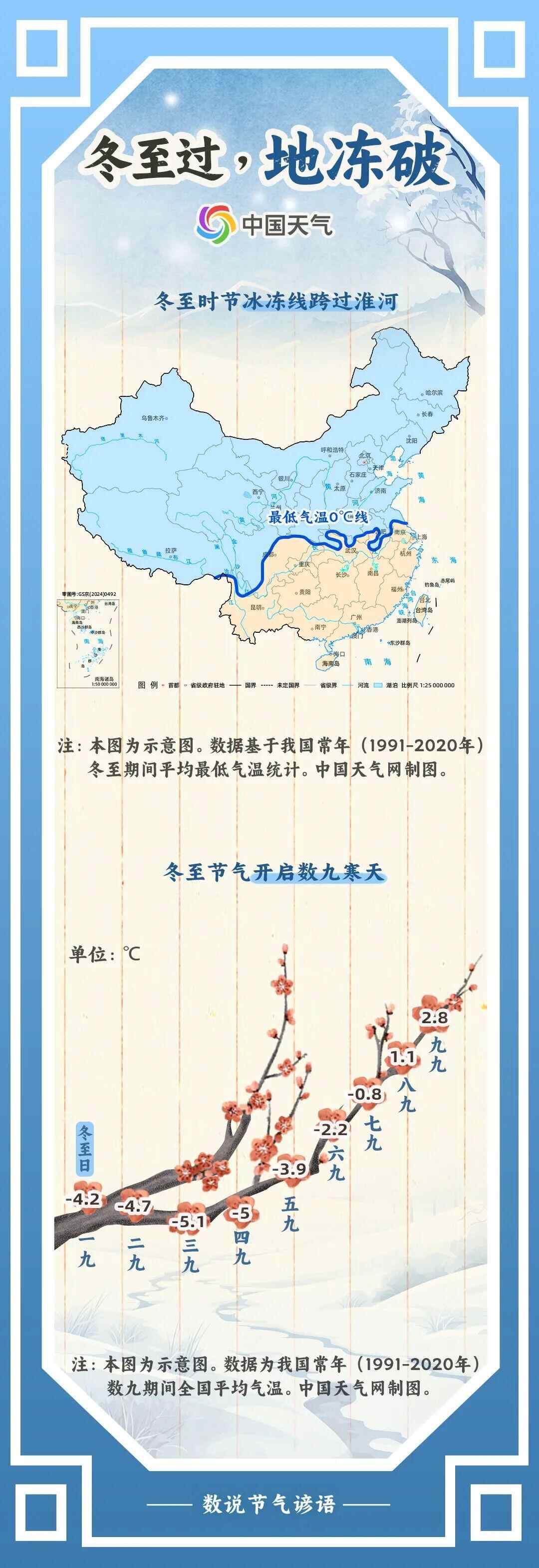 “冬至过,地冻破”,这一谚语就描绘了冬至过后严寒来临、大地冰封的寒冷景象。通过盘点1991年至2020年气象大数据发现,常年冬至期间,最低气温0℃线已跨过淮河,抵达苏皖中部、湖北北部、陕西南部至云南西北部一线。此时北方大部寒风刺骨,天寒地冻;南方多地可能出现降雪或冻雨,湿冷难耐。