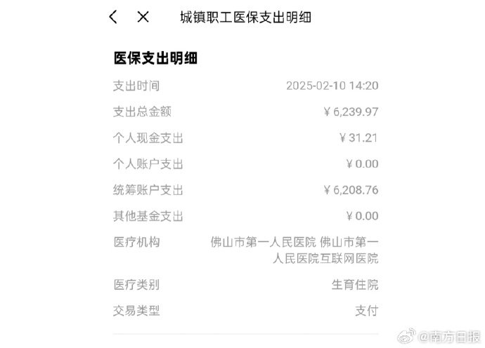 另一位在佛山市第一人民医院剖宫产的宝妈也感慨:“(医保)统筹给了挺多。”在她分享的账单中,生育住院支出总金额6239.97元,其中统筹账户支出6208.76元,个人现金支出31.21元。