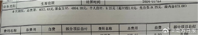“我是在南海区人民医院生的……最后出院没想到我的部分才花了9块钱,佛山生育报销力度还是挺大的!”根据宝妈自述,她是顺产分娩且没来得及打无痛,没有请导乐以及住单人间,就医总费用4063.43元,其中基金支付4054.18元,个人自付9.25元。不过该宝妈也说明,这是她个人生育住院的费用,不包括新生儿部分的费用。
