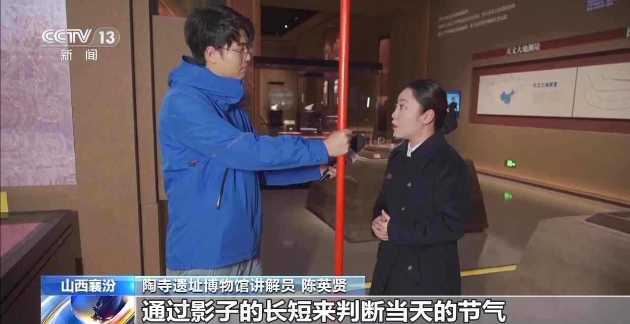 陶寺遗址博物馆讲解员 陈英贤:圭尺平放在地面,立表垂直于圭尺形成直角,正午的太阳照射立表投向圭尺产生影长,通过影子的长短来判断当天的节气。夏至当天日影是最短的,冬至的时候日影最长,与观象台也形成了相辅相成的作用。