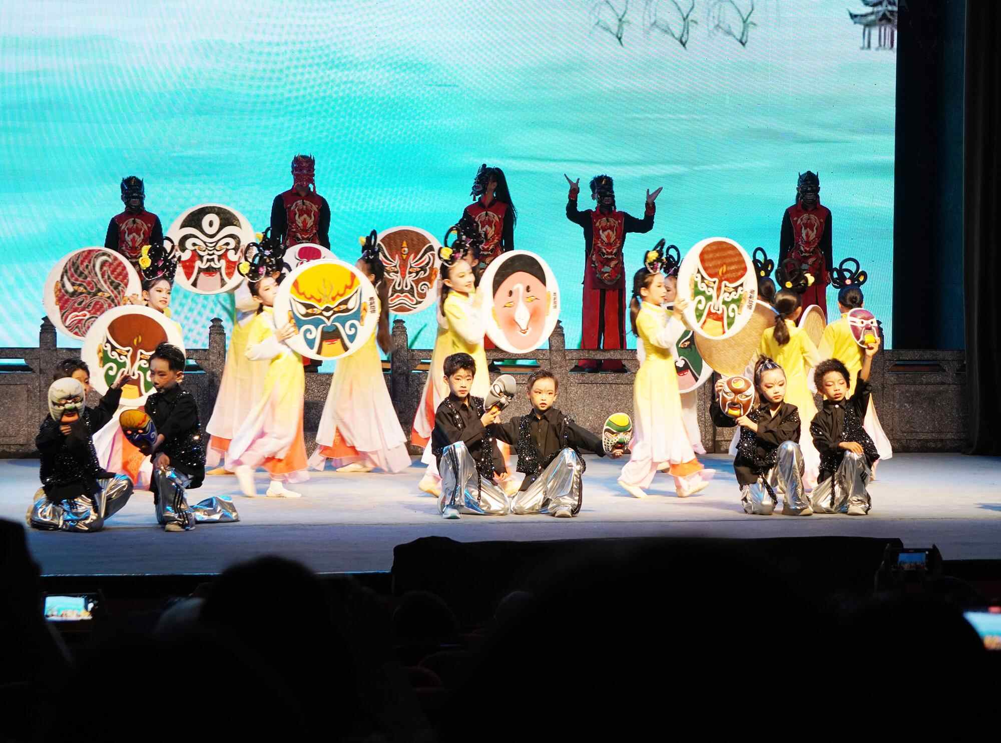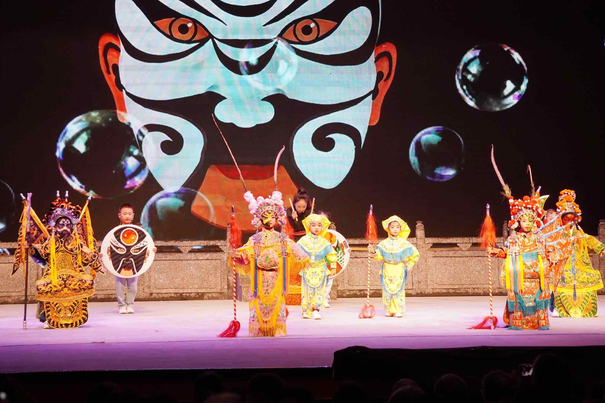 来自广东番禺中学附属幼儿园的孩子们献上《小小脸谱话英雄》,以粤语和精彩的表演为观众科普粤剧脸谱。在这群上台演出的孩子中,年纪最少的只有三岁。他们人小鬼大,在舞台上毫不怯场。