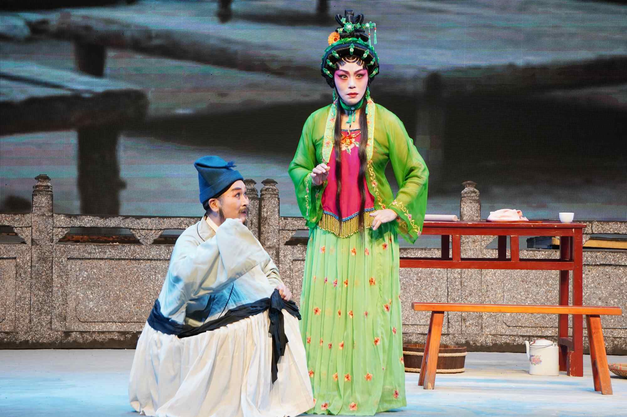 一级演员、第十八届中国戏剧梅花奖获得者梁淑卿与一级演员、广东粤剧院文武丑生洪梓铧联袂献演传统粤剧《金莲搓烧饼》。其中,现实身高约170厘米的洪梓铧需要在整场戏中蹲着表演,呈现武大郎矮小的形象。