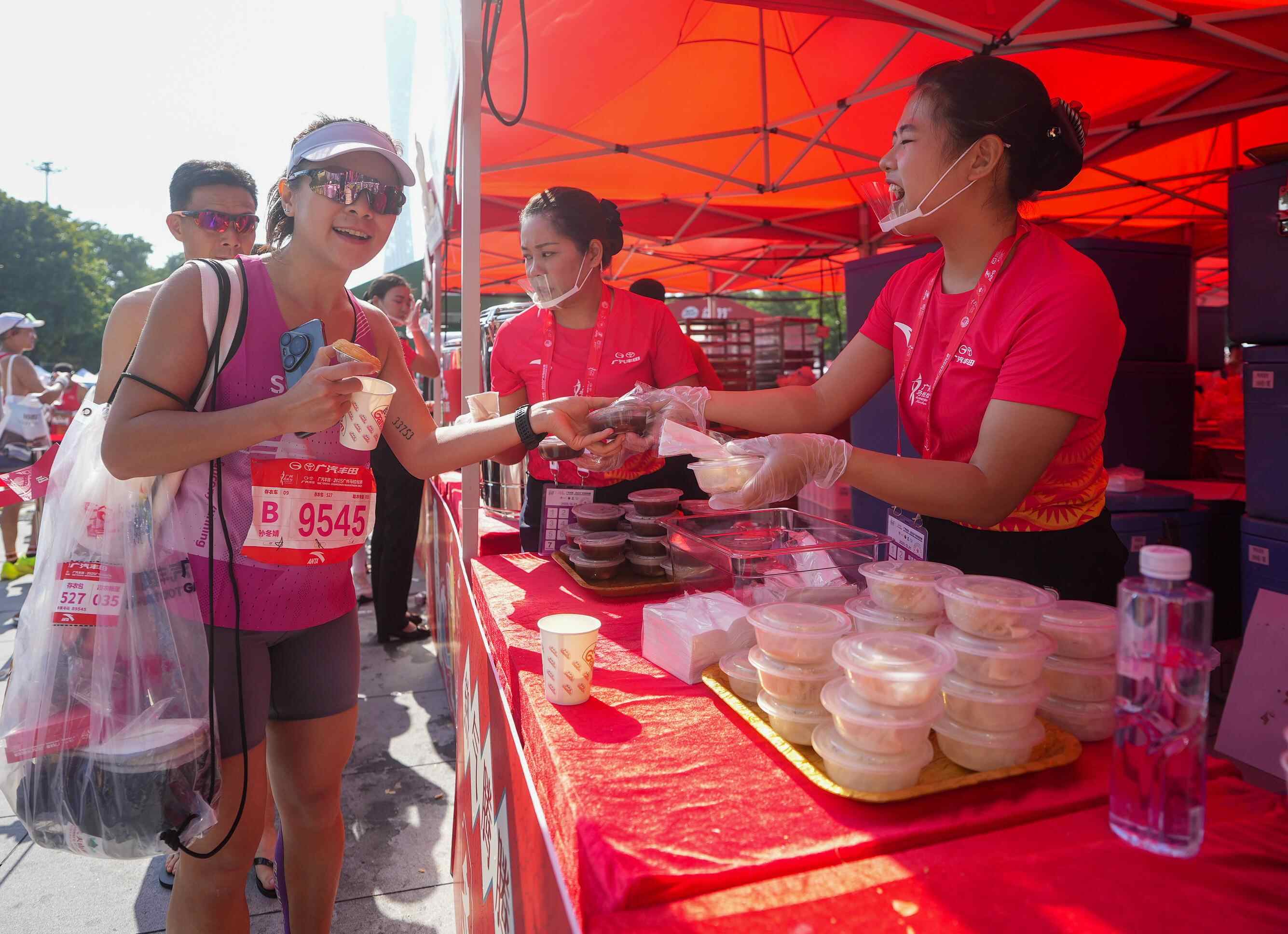 喷淋设施带来相对舒适体感,能量补充则直接恢复体能。除了赛会设置的官方能量补充点,不少跑团自发在广马赛道沿线设置能量补充点。广州西湖粤跑团,便在南方大厦附近设置了能量补充点,并把冬至应节食品汤圆带到了补给点。“汤圆带有糖分,能够补充跑手能量。”跑团成员梁杏芯介绍,跑团成员们4点已起床,为参加广马的跑手们准备食物。