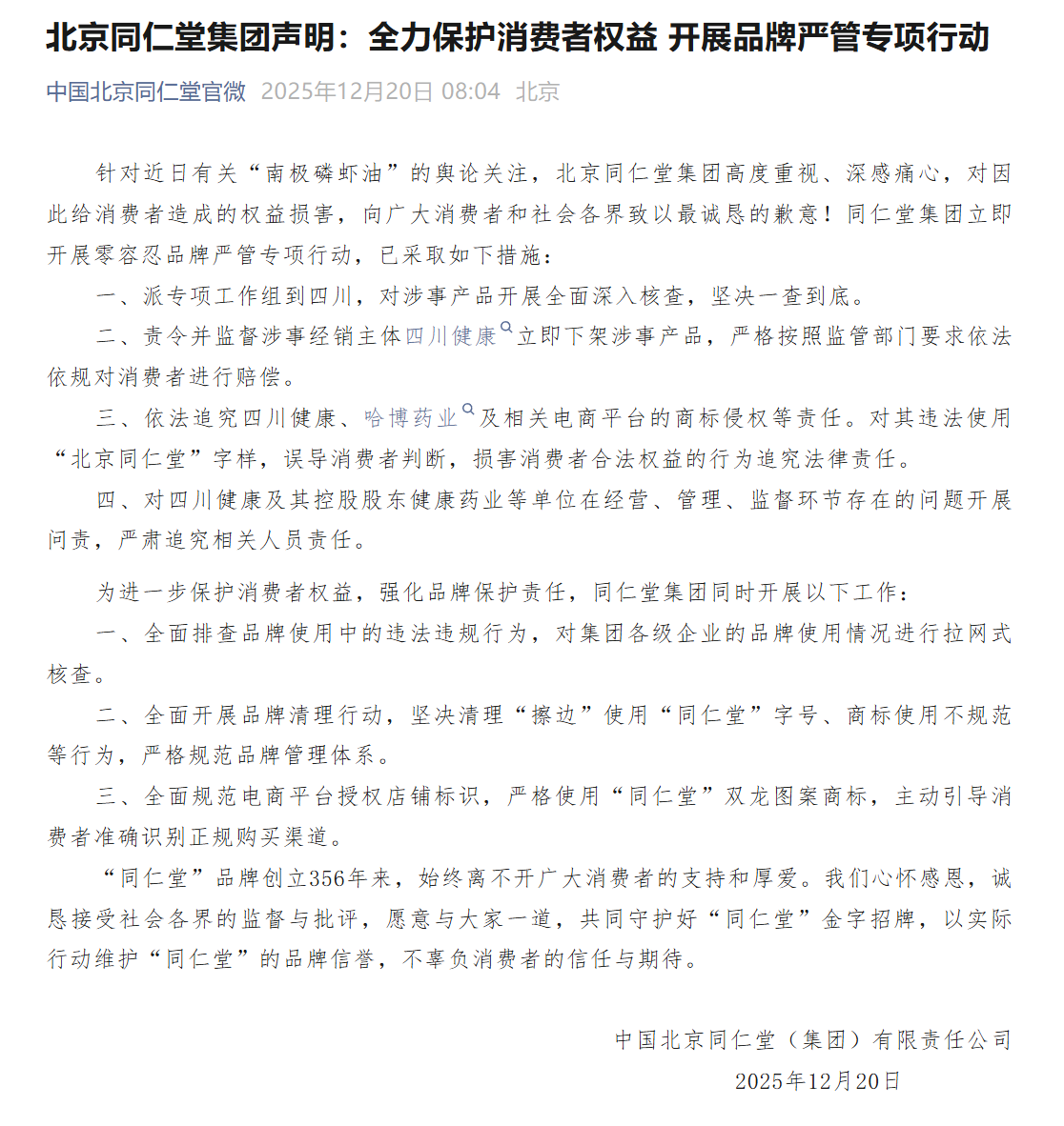 针对近日有关“南极磷虾油”的舆论关注,北京同仁堂集团高度重视、深感痛心,对因此给消费者造成的权益损害,向广大消费者和社会各界致以最诚恳的歉意!同仁堂集团立即开展零容忍品牌严管专项行动,已采取如下措施:
