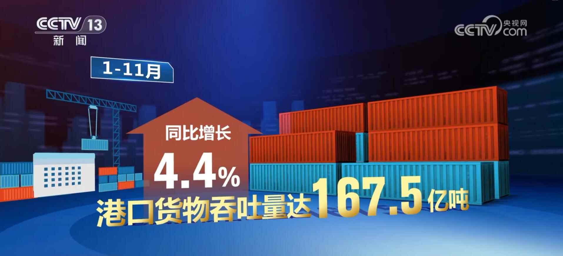 交通运输部数据显示,1—11月,港口货物吞吐量达167.5亿吨,同比增长4.4%;集装箱吞吐量达3.2亿标箱,同比增长6.6%。其中,外贸集装箱吞吐量同比增长9.5%。