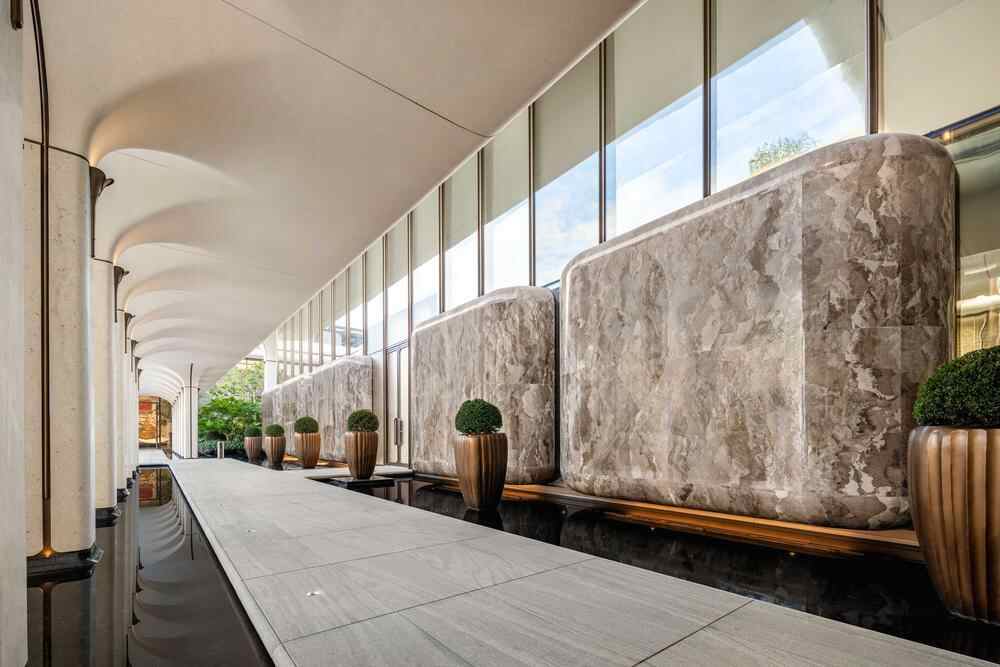在展厅的“精工区”,项目展示的不仅有精选石材,还有如何处理石材、木材与墙体工艺细节之间的“关系”。“天地墙对缝”工艺要求不同材质的拼接处缝隙连贯如一笔画;“隐缝”“脱缝”等处理手法,旨在消除视觉上的杂乱线条,让空间本身呈现出一种纯粹的、和谐的高级感。