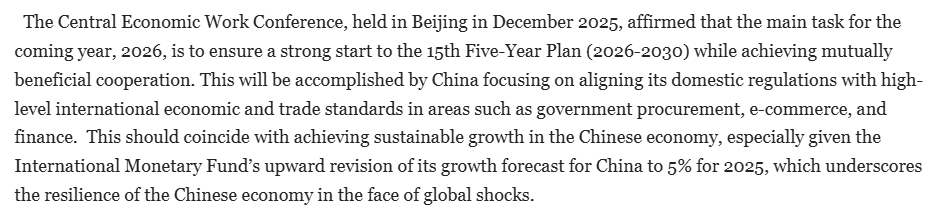 文章指出,2025年是中国“十四五”规划收官之年,2026年是“十五五”规划开局之年,在12月举行的中央经济工作会议处在一个承前启后的关键时间节点,对2026年经济工作重点任务进行部署,受到世界各国高度关注。世界期待从中国未来一年的经济规划部署中,获取灵感、捕捉机遇。