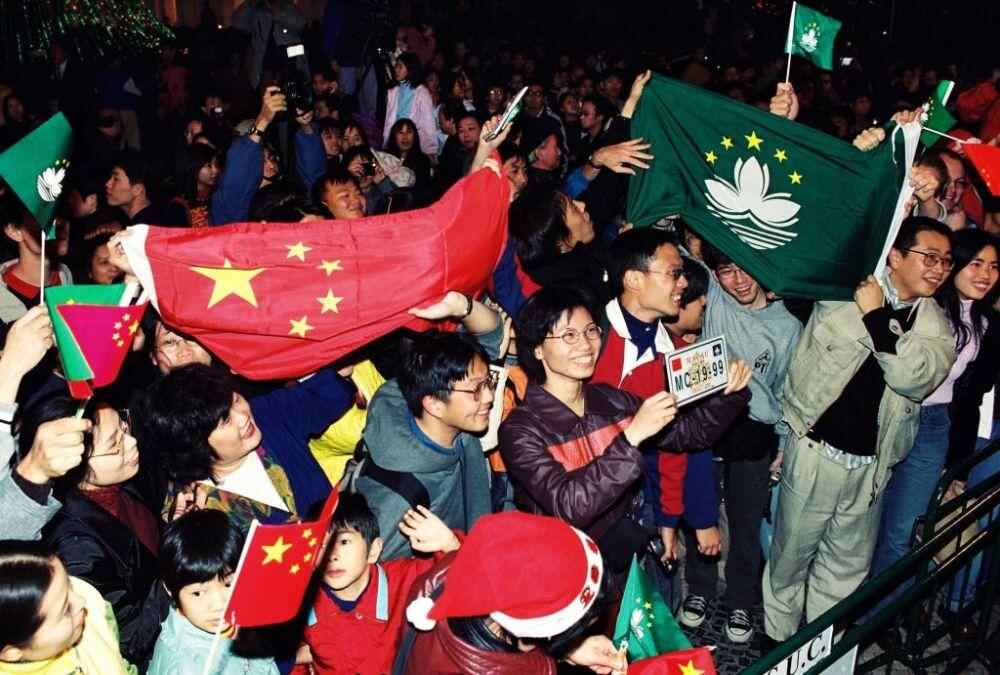 ▼1999年12月20日凌晨,澳门,民众在街头高举着中国国旗和澳门区旗,庆祝澳门回归祖国。