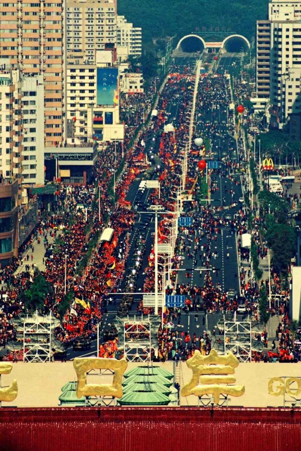 ▼1999年12月20日,广东珠海,20万市民在街头欢送解放军进驻澳门。