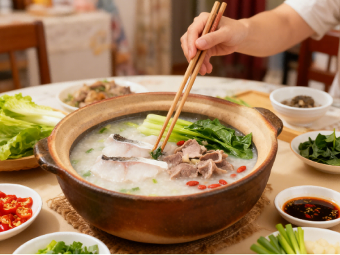 等锅里的食材涮得差不多,重头戏就来了,盛一碗吸满所有鲜味的粥水,米香、鸡鲜、海鲜甜混着肉香,一口下去暖乎乎的,鲜味儿十足。家人围坐着,你夹一筷子鱼,我捞一颗鱼丸,聊聊家常,喝口热粥,外头的寒意早就没了。