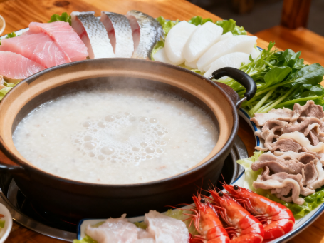 这锅暖粥的流行,是广东传统饮食的新生。早年间,顺德人爱在沸粥里涮鱼片,珠三角的大排档也有滚粥打边炉的吃法,只是粥渣容易糊锅,没能普及。十几年前,一些店家改良了粥底制法,把岭南生滚粥和清水火锅的精髓融在一起,既保留米香,又解决了粘锅底的问题。自此开始,以前只当早餐夜宵的粥,变成了正餐宴客的选择。