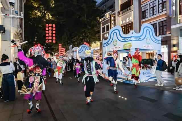 “咚咚锵、咚咚锵……”在北京路铜壶滴漏附近,循着急促而有韵律的锣鼓节奏,古装扮相的表演者迈出欢腾步伐,豪迈之气破阵而出。