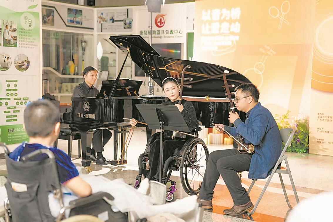 柔和的灯光下,轮椅上的杨博指尖触弦,与吴达兆老师共同演绎《良宵》,悠扬的旋律缓缓流淌,没有繁复的音响,没有华丽的舞台布景……12月1日晚,在广东省工伤康复医院的大厅里,一场“以音为桥,让爱走动”的不插电音乐会,让在场观众热泪盈眶。毕业于星海音乐学院国乐系的青年二胡教师杨博,身着素雅演出服,背后是2023年坠梯事故留下的终身脊髓损伤与截瘫,眼前却是被音乐串联的无数张笑脸。当最后一个音符落下,她眼含热泪。这场由她总策划的音乐会,不仅是一次艺术呈现,更是星海音乐学院博物馆无障碍服务实践的生动注脚。