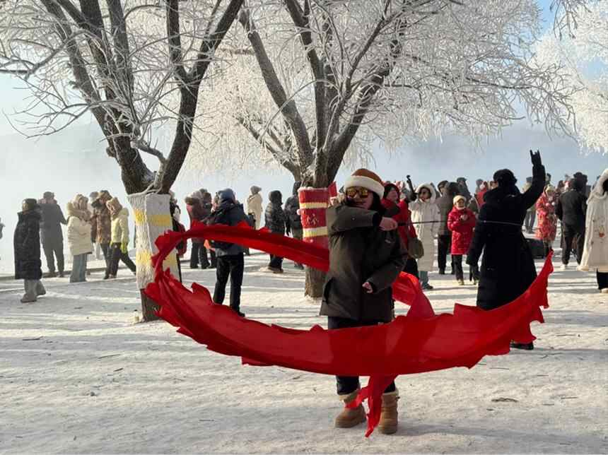 游客在冬日雪景中挥舞着红绸。人民网记者 李思玥摄
