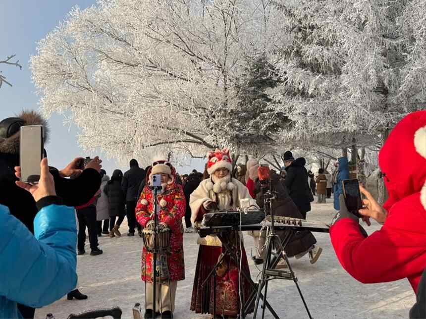 松花江畔,身着特色服饰的表演者在雾凇树下进行表演,吸引众多游客举起手机记录这一精彩瞬间。人民网记者 李思玥摄