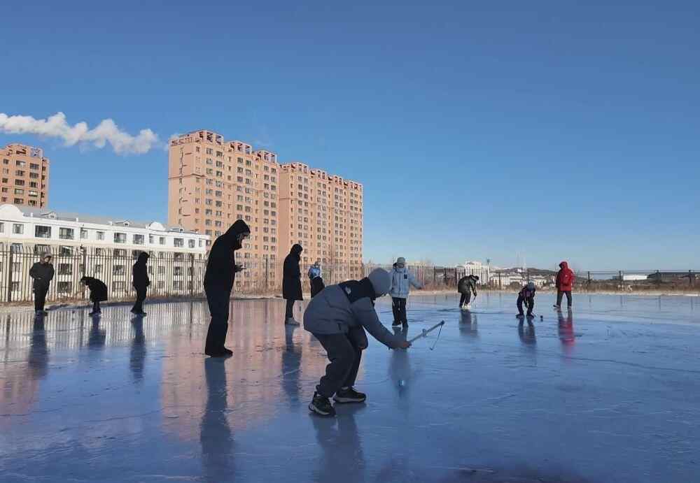 学生们在绥芬河市高级中学的冰场上进行“抽冰尜”比赛。(受访者供图)