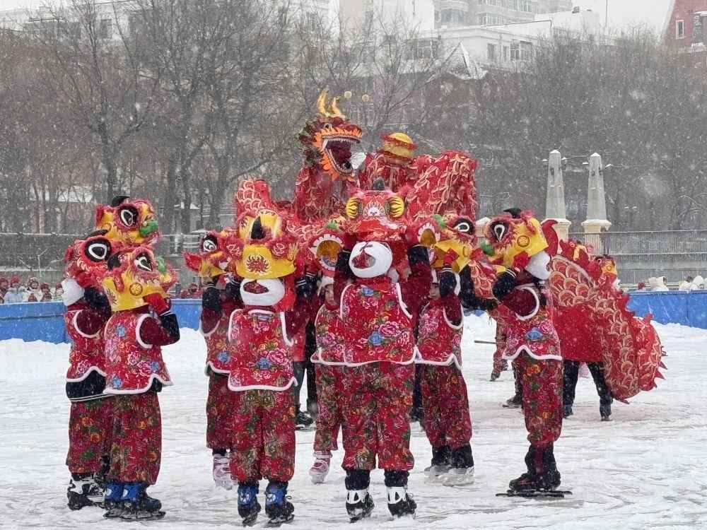 在2025年哈尔滨市“中小学生冰雪周”启动仪式上,哈尔滨市清滨小学校的学生表演冰上节目《龙腾狮舞》。新华社记者 沈易瑾 摄