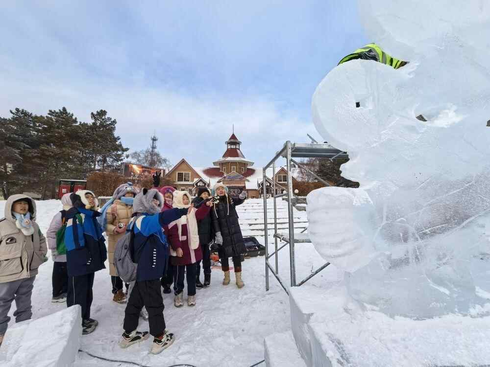 孩子们在中外冰雕大师指导下