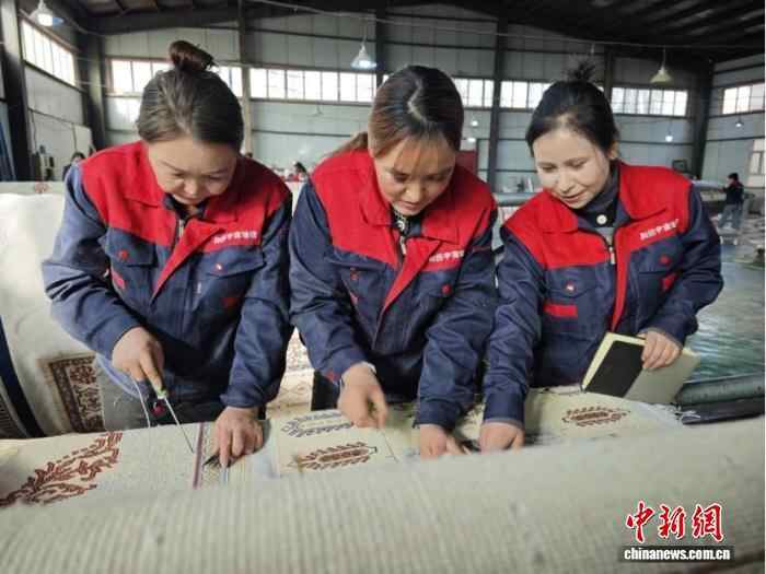 阿尔孜古丽(右一)在生产线上查看地毯编织流程工艺。闫兆霞 摄